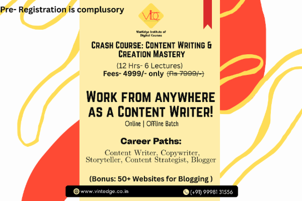 VIDC ka “Crash Course: Content Writing & Creation Mastery” ek beginner-friendly, Hinglish format course hai jisme aap seekhenge:
